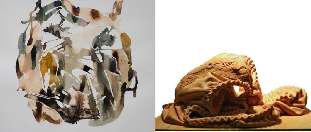 Susanne Winter stickt Fadenzeichnungen mit farbigen Flächen und griffigen Formen, die durch das Hin und Her der Fäden, durch Verdichtungen und Verknotungen entstehen. In ihren Papierarbeiten experimentiert sie mit selbstgewonnenen Naturfarben und bringt diese durch Schütten auf einen künstlerischen Weg.