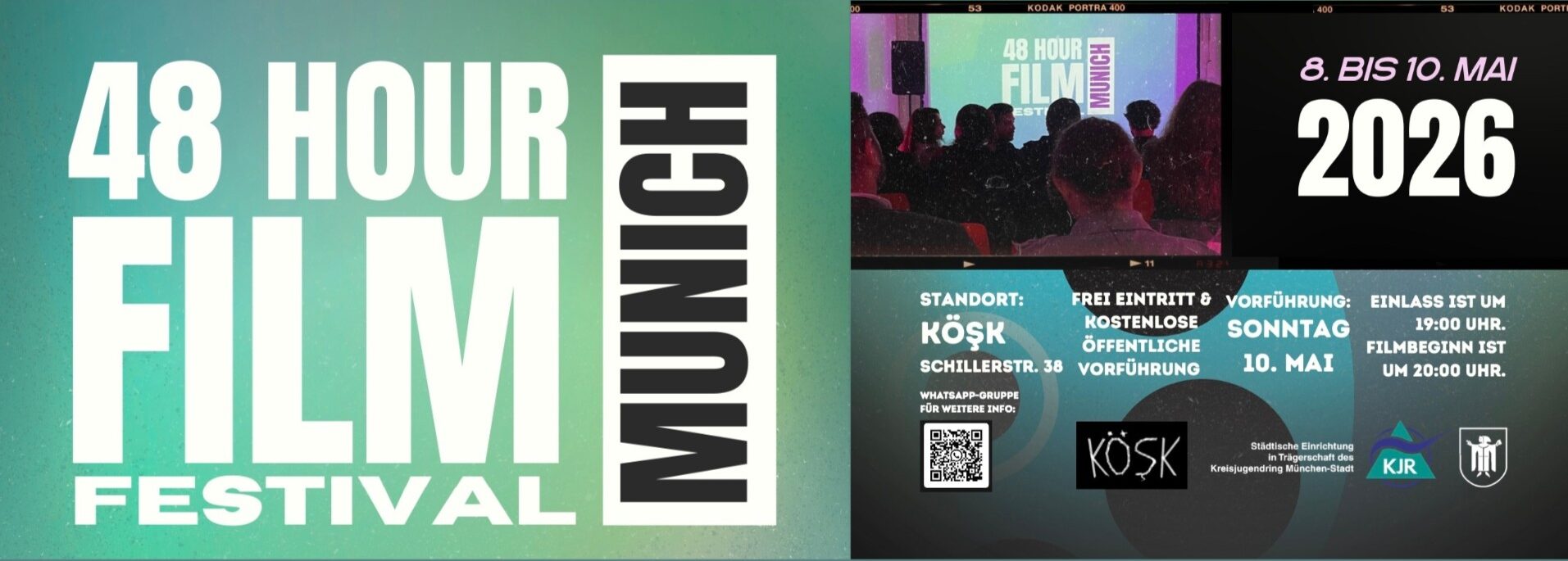 Tritt unserer WhatsApp-Gruppe bei und registriere Dich mit dem QR-Code (siehe Bild! oder über das Foto auf der Internet-Seite: https://www.koesk-muenchen.de/48-h-film-festival-2026/), um weitere Informationen und die Bekanntgabe der Genres am 8. Mai zu erhalten. Alle Filmbegeisterten sind willkommen – egal mit welchem Equipment!