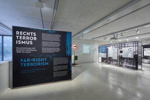 Bild: Blick in die Ausstellung Rechtsterrorismus, 2024 | © NS-Dokumentationszentrum München, Foto: Connolly Weber Photography