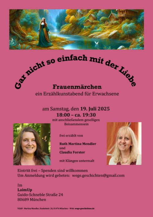 Die Erzählerinnen Claudia Forster und Ruth Martina Mendler nehmen euch mit auf eine Reise durch die Welt der Fantasie. Sie erzählen von Frauen, welche für ihre Liebe so manche Hürden überwinden, und mit Einfallsreichtum für sich und das Schicksal ihres Liebsten eintreten. Die Märchen und Sagen aus aller Welt nehmen so manch überraschende Wendung. Lasst also auch euch überraschen an diesem unterhaltsamen Erzählabend!