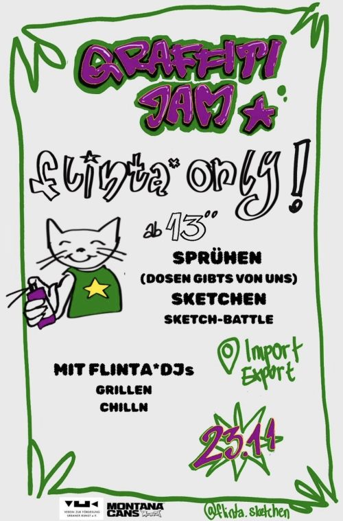 Wir als FLINTA* Sketch – Kollektiv wollen einen Raum schaffen für Alle, die sonst immer dafür kämpfen müssen. Egal ob du noch nie ne Dose in der Hand hattest oder schon längst Graffiti lebst, komm vorbei !