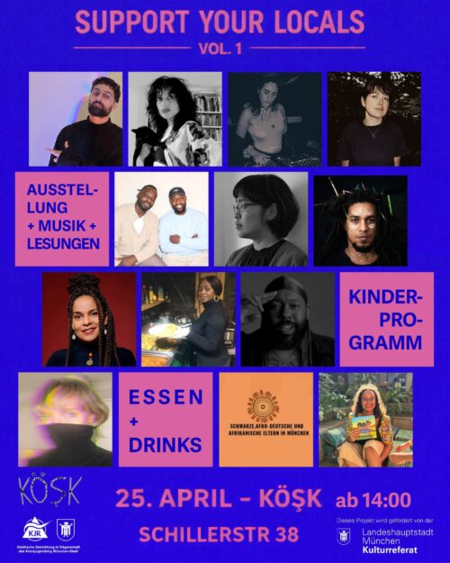 Am 25. April 2026 starten wir im KÖŞK mit dem ersten Teil unserer dreiteiligen Veranstaltungsreihe. Zum Auftakt erwartet euch ein vielseitiger Nachmittag und Abend mit Ausstellung, Lesungen für verschiedene Altersgruppen, Live-Musik, DJ-Set, Kinderprogramm sowie Essen und Drinks. Es geht ums Zusammenkommen, Entdecken, Zuhören und Austauschen – um Kunst, Literatur und Musik aus der Stadt für die Stadt.Kommt vorbei, bringt eure Leute mit und feiert mit uns Münchens kreative Vielfalt. 💛