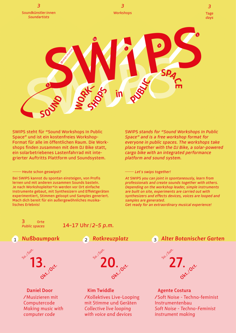 SWIPS steht für “Sound Workshops In Public Space” und ist ein kostenfreies Workshop Format für alle im öffentlichen Raum. Die Workshops finden zusammen mit dem „DJ Bike“ statt, ein solarbetriebenes Lastenfahrrad mit integrierter Auftritts Plattform und Soundsystem.