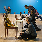 Für das Werkstattwochenende „Demontage des Puppenheims“ im Februar 2023, das sich mit rassismuskritischem Umgang mit Puppen in Theater und im Museum beschäftigte, entwickelten die Künstler*innen Sarah Bergh, Claude Jansen und Fabrice Mazliah eine Performance, die frei nach Marina Abramovics „The artist is present“ eine 1-zu-1-Begegung mit Figuren aus der Sammlung Puppentheater ermöglicht. Mit nachdenklichen, witzigen und poetischen Nachrichten ausgestattet, fordern die Puppen die Besucher*innen zu einer Hinterfragung von Stereotypen und des Subjekt-Objekt-Status heraus.