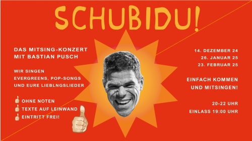 Gemeinsam singen ohne regelmäßige Chorproben? Dann bist du beim SCHUBIDU im Kulturhaus Milbertshofen genau richtig! Ab sofort einmal pro Monat wird der Saal des Kulturhauses zum Zentrum der guten Laune, wenn ihr querbeet eure Lieblingslieder singt: Pop-Songs, Schlager & Evergreens Die nächsten Termine: 27.04.25 25.05.25 Beginn 20 Uhr, Einlass 19:00 Uhr Der Eintritt ist frei […]