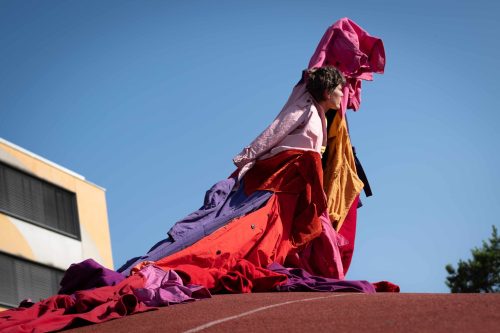 50 Ärmel, 57 Taschen, 180 Knöpfe, 3 Gürtel, 2 Kapuzen, Schlaufen, Ösen, Reissverschlüsse und vieles mehr. Durchmesser: 6 Meter. Farben: rot, pink, lila, orange und Zusatzfarbe: gelb! Was ist flach wie eine Flunder, hoch wie ein Elefant, verzweigt wie eine Riesenkrake, geruhsam wie eine Landschildkröte und frei wie ein Falke? Das ist: MÄRML. Ein Phantasiewesen, […]
